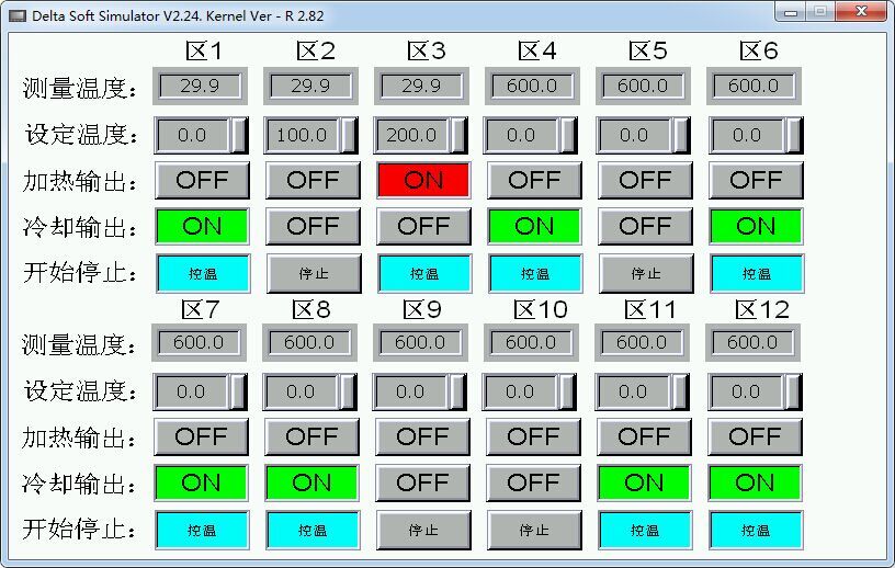 以下是我公司为某挤出机设备厂做的触摸屏界面,12路温度可以同时显示在界面上,控制开始停止操作方便,输出口状态全部显示在界面里